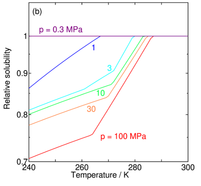 我々のグループの新しい論文が出版されました。 この論文では、液体二酸化炭素(CO2)中への水の溶解度を、水または CO2 ハイドレート(包接水和物)が共存する条件下で、理論計算を用いて研究しました。主要な焦点は、低温・高圧条件下でハイドレートが形成されることによる溶解度の低下を定量的に評価し、その温度および圧力依存性を明らかにすることにあります。この研究は、二酸化炭素回収・貯留(CCS)におけるパイプライン閉塞や腐食といった CO2 大量輸送に伴う実用的な課題に関連する熱力学的特性に貴重な情報を提供します。研究チームは、化学ポテンシャルの計算を通じて、特定の水ポテンシャルモデルの自己分極エネルギーに対する補正を導入することで、実験的に観察される溶解度曲線を高い精度で再現しています。 Tanaka, H. et al. The solubilities of water in liquid CO2 coexisting with water or hydrate. J. Chem. Phys. 163, 124504 (2025) DOI:10.1063/5.0294608